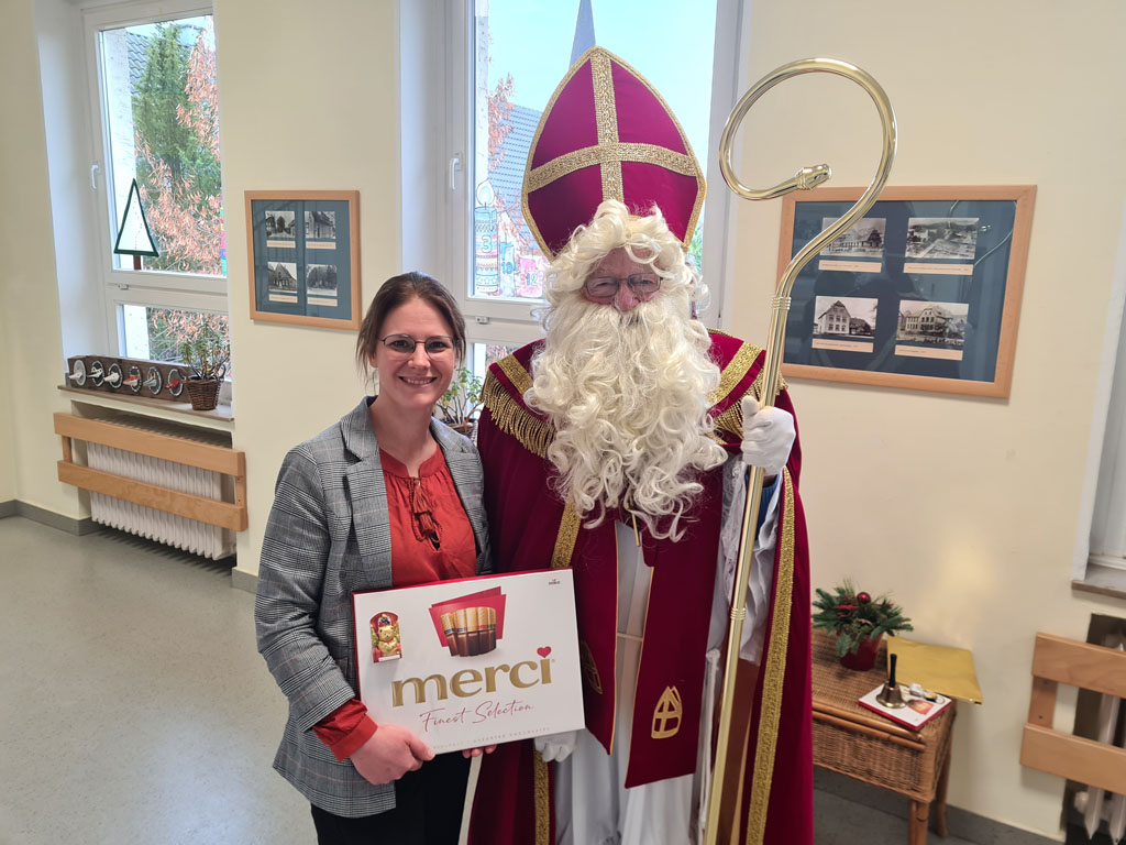 In seinem prächtigen Gewand, dem Bischofsstab in der Hand, mit dem goldenen Buch unter dem Arm und einem Engelchen an seiner Seite sorgte der hohe Besuch für begeisterte Kinderaugen. Mit großer Aufmerksamkeit lauschten die Schülerinnen und Schüler den Worten des heiligen Mannes, der liebevolle, manchmal auch mahnende Worte aus seinem Buch vorlas. Auch die Kinder hatten sich bestens vorbereitet: Mit fröhlichen Tänzen, Liedern und kleinen Gedichten überraschten sie den Nikolaus und brachten ihn mehr als einmal zum Staunen und Schmunzeln.
